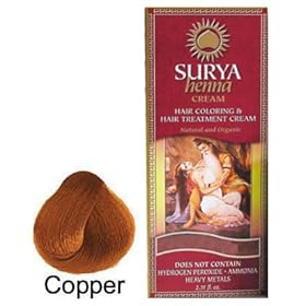 Surya henna Brasil CreamHair Coloring & Hair Treatment Cream,Copper2.31 fl oz (70ml)Surya Henna cream colors while revitalizing, moisturizing and conditioning your hair. Its formula, enriched with natural extracts, nourishes hair for increased luster, softness and elasticity to the hair threads. It colors without severing the original structure of capillary keratin and forms a protector film around each thread, protecting the health of your hair.Surya Henna cream is a new concept in hair coloring and treatment which doesn't harm your hair and your health. They have developed this formula using natural and exotic herbs and fruits from India and the Brazilian Amazon Forest.Inspired and guided by the principles of Ayurvedic medicine, Surya Henna products improve the health of your hair by using plants that have beenused successfully for thousands of years.Surya Henna Cream is available in 15 different color tones ranging from blonde, brown, red and black.Surya Henna Quality Guarantee:-does not contain peroxide, ammonia, heavy metals, parabens, ppd, resorcinol or other ingredients which may cause harm to the health or to the environment -no animal testing, does not contain ingredients of animal origin. -raw materials extracted with environmental responsibility prusuing sustainable development. -does not contain genetically modified substances.Benefits of Surya Henna Cream: -Guaranteed to cover gray and white hair in the first application! -Intensive treatment and shine from scalp to hair-ends -May be used safely after hair has been treated chemically, i.e. permanent wave, smoothing, toning etc.